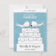 Cute white birds bride and groom kiss on top of four tiered wedding cake. A sweet wedding save the date announcement that can be easily personalized with your own names and information. These love birds invitations are part of a wedding theme collection by Jenn’s Doodle World.
