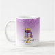 This elegant bakery business coffee mug features an illustration of an ornate purple and gold wedding cake on a purple ombre background, with a top border of purple dripping faux glitter. Customize it with your business name in black handwriting script with swashes at the beginning and end, and your name in black sans serif font. (To keep the swashes, replace only the letters in those text fields, leaving the symbols in place.) The design appears on both sides of the mug.