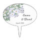 Wedding cake topper is shown in a lovely lavender color floral print with custom sample names shown in a lovely script text in a black color.