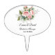 This wedding cake topper is shown with a lovely pink rose's floral bouquet with bride and groom personalized names and wedding date.