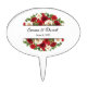 Wedding cake topper is shown in a lovely red rose floral print with custom sample names shown in a lovely script text in a black color.