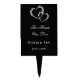 This wedding cake topper is shown with a two hearts design with hearts in a sparkling diamonds image and white text.