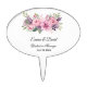 This wedding cake topper is shown with a lovely pink-purple floral bouquet with bride and groom personalized names and wedding date.