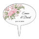 This wedding cake topper is shown with a pink roses image, personalized names and wedding date.