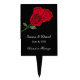 Wedding cake topper is shown in a lovely red rose floral print with custom sample names shown in a lovely script text in a black color.