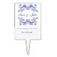 This wedding cake topper is shown with a lovely filigree design. Text of bride and grooms names, wedding date and the phrase "Together As One". Text shown in sapphire/navy blue.