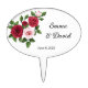 Wedding cake topper is shown in a lovely rose floral print with custom sample names shown in a lovely script text in a black color.
