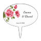 Wedding cake topper is shown in a lovely rose floral print with custom sample names shown in a lovely script text in a black color.