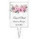 This wedding cake topper is shown with a lovely pink-purple floral bouquet with bride and groom personalized names and wedding date.