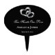 This wedding cake topper is shown with a two hearts design with hearts in a silver tone with faux crystals and white color text on a black color background.