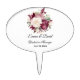 This wedding cake topper is shown with a lovely burgundy peony floral bouquet with bride and groom personalized names and wedding date.