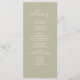 This design features a wedding, menu card, elegant, calligraphy, script, sage green, greenery, classic, simple meal course, with a monogram and ampersand design on the back