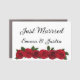 Wedding custom name just married car magnet is shown in white with a red roses print and has black text.