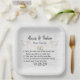 Fun trivia facts about the bride and groom with pair of doves and wedding rings on whitewashed wood.