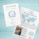 Modern and Elegant World Map Invitation Wedding Destination, like passport with dusty blue watercolor floral crest monogram