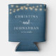 Wedding Dinner and Party, Rustic String Lights, navy blue wood background Can Cooler