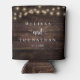 Wedding Dinner and Party, Rustic String Lights, dark brown tan wood background Can Cooler