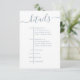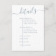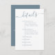 This simple details timeline enclosure card with a dusty blue color scheme features a modern wedding details simple timeline, with dusty blue light coneflower blue, a stylish trendy calligraphy script text, with QR code rsvp website online, a wedding guest response web address, with more details information info URL, a simple minimalist minimal style design, simple classy typography web address, a guest details and information internet, simple invitation enclosure card