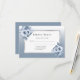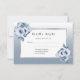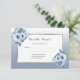 An elegant and simple RSVP card for a wedding with templates for reply by date and names. A faux silver and white frame adn watercolored flowers in shades of blue. A chic dusty blue gradient, ombre background, dark gray text on front.