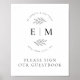 Composed of simple straight lined frames with classic sans serif and serif typography. These elements are simple, timeless, and classic. "Please Sign Our Guestbook" is written below the monogram.