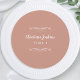 Fully customizable elegant wedding round plate guest place cards feature a delicate design in crisp white on a formal rose gold color background. Delight your guests with personalized cards featuring each guests name & table number! The opposite side is solid rose gold color. Two delicate decorative flourishes each containing a single heart delicately envelope the name of the guest. Customize our simple to use template with your own wedding details! Order each card separately after customization of guest name with the template.