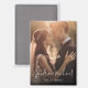 Fridge magnet featuring the couple's names in a handwritten style script font with the date below as an overlay over a custom photo.