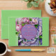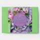 "You Are Cordially Invited to Attend The Wedding of -The Parties- ", In Holy Matrimony & The Date", inside A Circle Horizon (Violet with Plum Border), surrounded by a Boquete of Pink & Violet Peonies with flowing Satin, Violet Ribbon & Bow, with "Date", above & "Official Invitation inside", below Circle Horizon, all on Violet background. - Enlarged Flower background, Leaving Very Wide Border at side & Bottom edges & Pink Tulips match up. -----