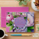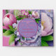 Beautiful & Elegant, Boquete of Pink & Violet Peonies with Satin Violet Bow at Bottom, surrounding A (Violet) Circle Horizon, topped with "Our Wedding" & "Date", on Layered (Two Shades at Top) Violet background.