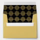 Custom elegant gold colored wedding envelopes feature an ornate art deco pattern that is printed on the inside of flap in black and gold, and return address text on outside of the back flap.
