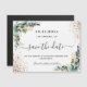 A trendy wedding Save the Date magnet. A stylish white background decorated with eucalyptus foliage, golden foliage and faux gold glitter dust. Personalize and add a date, names and text. The text: Save the Date is written with a large trendy hand lettered style script with swashes.