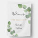 Welcome to an elegant wedding reception, party. A chic white background. Decorated with green watercolored eucalyptus leaves, sprigs, greenery. Personalize and add the names of the bride and groom. Black and golden letters.