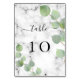 Marble stone print as backgrond decorated with a eucalyptus greenery sprigs. Personalize and your table numbers. Black letters.