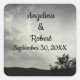 This beautiful wedding sticker features a photo that captures an evening landscape with the sun's rays breaking through the gray and white clouds. The land appears in black silhouette along with the branches of a distant tree. The sunlight creates diagonal lines across the two-tone sky. The bride and groom's name and wedding date appear in black script and can quickly be personalized.