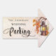 A rose gold, blush pink gradient background. Decorated with a vintage lantern and orange fall tree leaves. Personalize and your family name. Black letters. With the text: Parking