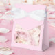 Wedding favor box shown in pink with a white ribbon bow and a photo print of pretty pastel pink roses.