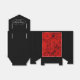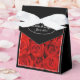 This wedding favor box is shown in black with a white ribbon bow and a red roses print on the front. Shown with sample names and date.