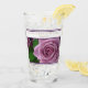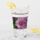 Celebrate your special day with this clear glass tumbler has a photo image of a lavender-pink-mauve colored rose on front and back along with fuchsia purple accent stripes. Golden-tan text of your personalized names and date above the roses over white.