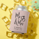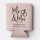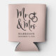 Give a wedding toast and your wedding guests a fun souvenir keepsake of your special day with this custom blush pink can cooler with "Mr & Mrs" written in a large script and an illustration of two wedding rings joined together. Add your name and wedding date.