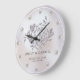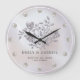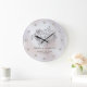 An elegant iridescent monogrammed first wedding anniversary clock with a chic silver glitter spray of heart shaped flowers and leaves. Subtle soft hues with glitter touches and your name and wedding date.
