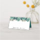 This folded name place card is shown in basic white with a lovely teal color peony floral mix accent and has sample custom names.