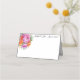 This folded name place card is shown in basic white with a lovely pink and orange color peony floral mix accent and has sample custom names.