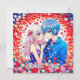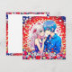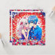 Personalized thank you notes for your anime themed wedding. Red, blue and white flowers and a cute anime couple cuddling.