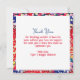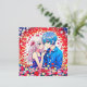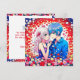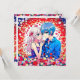 Personalized thank you notes for your anime themed wedding. Red, blue and white flowers and a cute anime couple cuddling.