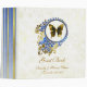 Elegant wedding guest book done in a cream and gold mottled background, with pretty digital artwork of a golden butterfly, inside a decorative circle, and matching stripes on the spine. Customize with your text to personalize. Add pages and insets from your local store or online.