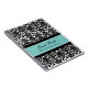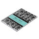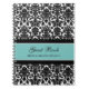 Spiral wedding guest book notebook in turquoise blue, black and white classic floral damask pattern, with customizable text to add your own name and wedding date.