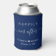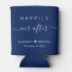 Navy blue wedding can cooler party favors with "Happily Ever After" in a mix of simple white typography and a trendy white script with swashes, your first names and the date.