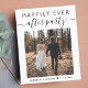 Budget-friendly modern elopement or smaller wedding announcement and reception invitation. The front features your wedding day photo and "Happily Ever After Party" in a mix of simple typography and trendy script with swashes. Under your photo, add your first names and wedding date. On the reverse side, personalize your wedding announcement and reception invitation in more detail, input your wedding website URL address to create a QR code for guests to scan to see your wedding photos, all the details and to RSVP online, and add your names in a signature-like script.