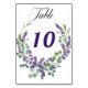 A stylish white backgrond decorated with violet, lavender florals and eucalyptus greenery. Personalize and your table numbers. Black and purple letters.