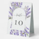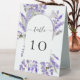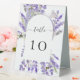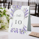 A stylish white backgrond decorated with an arch frame of violet, lavender florals. Personalize and your table numbers. Black letters.