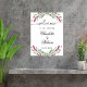 A chic white background. Decorated with pink lavender florals, flowers and eucalyptus greenery. Violet and black letters. Personalize and add your names and the wedding date.